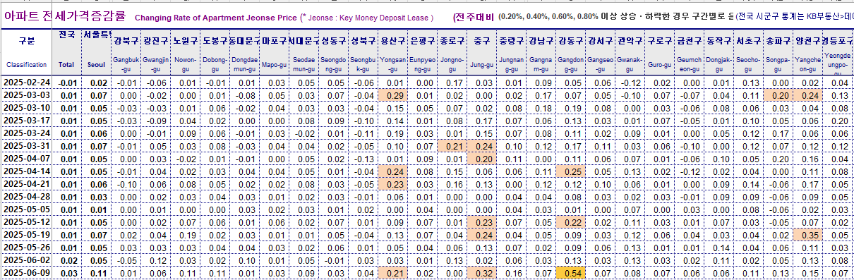 상승은 강남구, 서초구, 용산구, 송파구, 강동구, 양천구의 상승이 높게 나왔습니다.