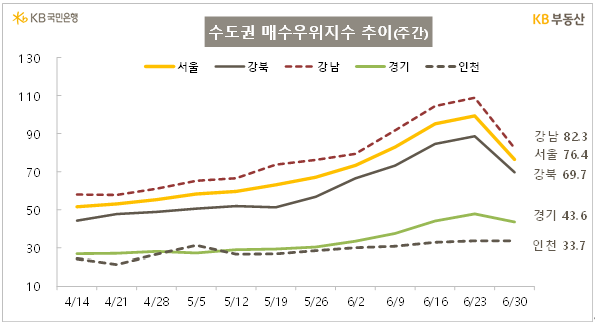 서울지역은 76.4로 가파른 상승후에 하락을 기록하였습니다.