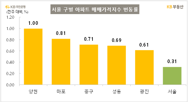 상승은 양천구, 마포구, 중구, 성동구, 광진구가 높게 나왔습니다.